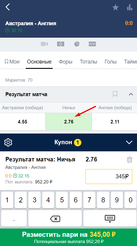 №3 – на странице матча кликнуть по коэффициенту исхода. Например, ничья.